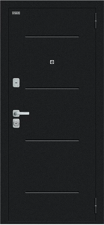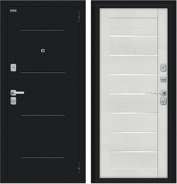 Надежная входная Дверь Браво Техно/BChrome Букле черное/Bianco Melinga премиум класса по цене 35 071 руб. Большая толщина стали защитит от проникновения в ваш дом, квартиру или коттедж. Используется очень качественная фурнитура: замки, цилиндры, ручки, защелки. Покрытие и отделка двери изготовлено под внимательным контролем производителя. Дверь имеет долгий срок службы и гарантию.